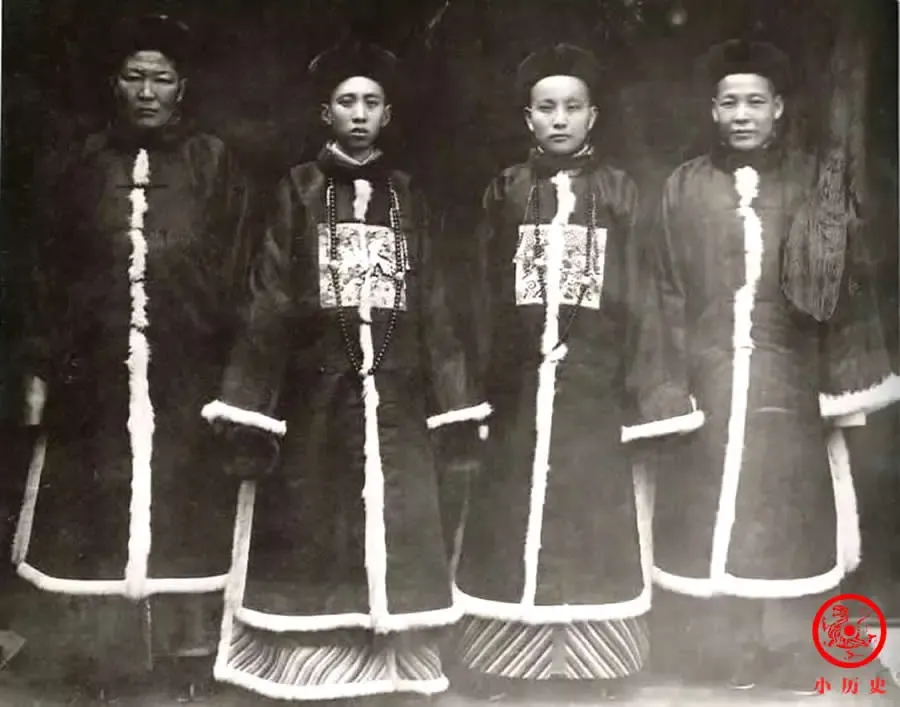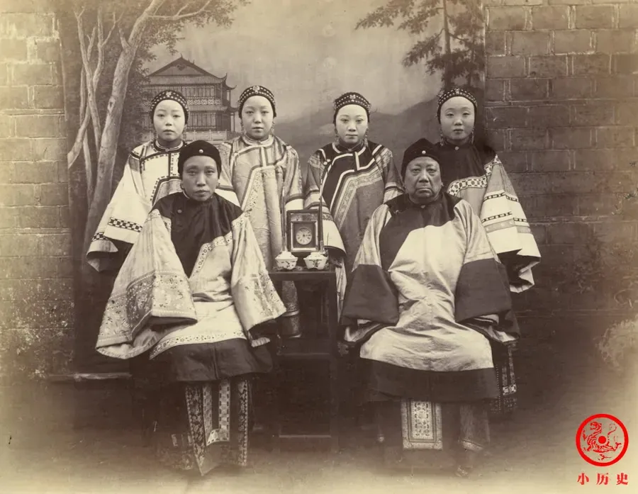 她们头戴抹额、身穿袄裙,装扮比较讲究,应该来自中等以上家庭。前排右侧那位老太太气场很强大,一看就是一家之主。