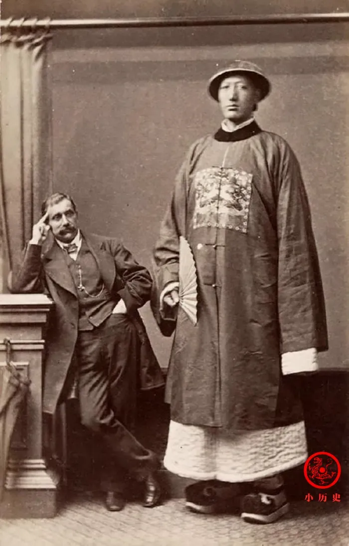 目测这位巨人的身高超过了2米。他穿着只有官员才能穿的补服,并不能说明他获得了官职。他只是被外国演艺机构发掘的演员,凭借出众的身高表演杂耍,那身补服用来向外国人展示他作为中国人的身份。
