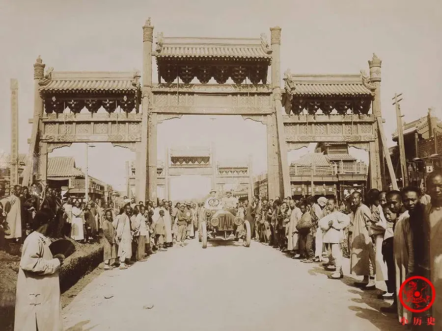 1907年,北京东四牌楼下的汽车。
