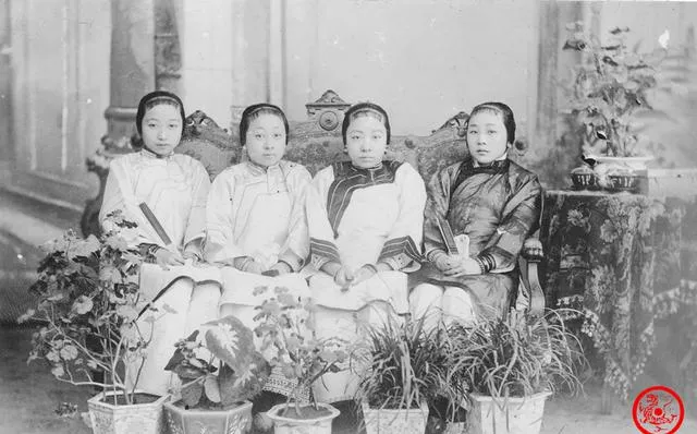 图中四位姑娘坐得端端正正,后头是布景花屏,前头一圈盆栽摆得满满当当,衣料是细致的缎面,领口袖口都缀着滚边,脸上粉面轻描,手里还搭着团扇或者帕子,奶奶看见这类旧照就爱嘀咕,**“大脸盘旺家,眉眼清顺才好命,”**那会儿相馆里摆花摆草,可不是为了好看那么简单,讲的就是喜气和殷实。