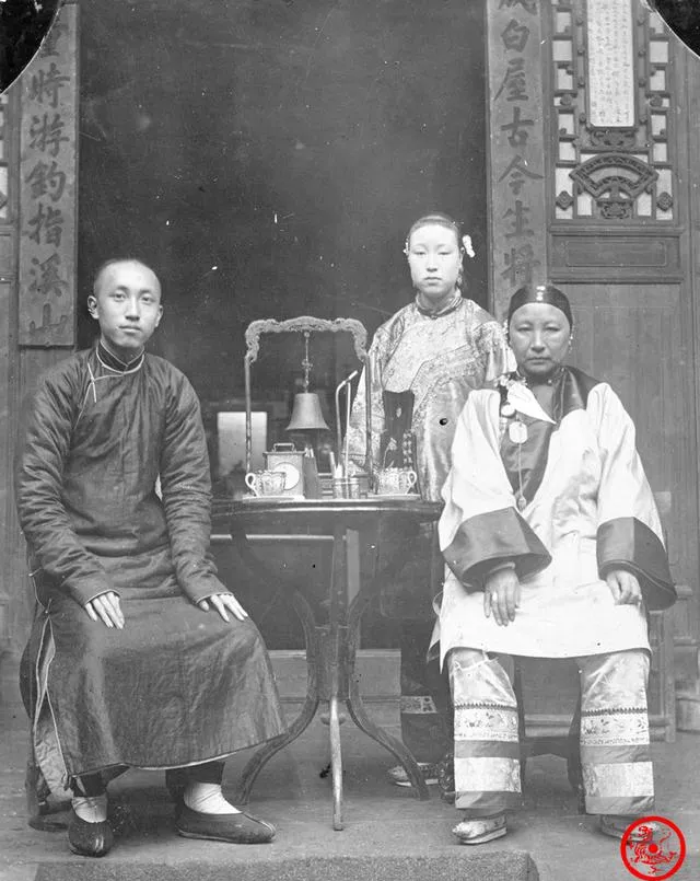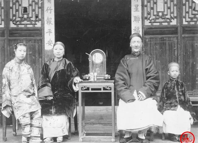 同一家再来一张,婆媳换了绸衣,男人坐在一旁,桌上多了个铃形的小摆设,像是新奇玩意儿,照片里看不见笑,可你要是盯久了,会觉得他们想笑又收住的劲儿挺有意思,那个年代照相是大事,摆好姿势,屏住气儿,心里热闹,脸上还得端着呢。