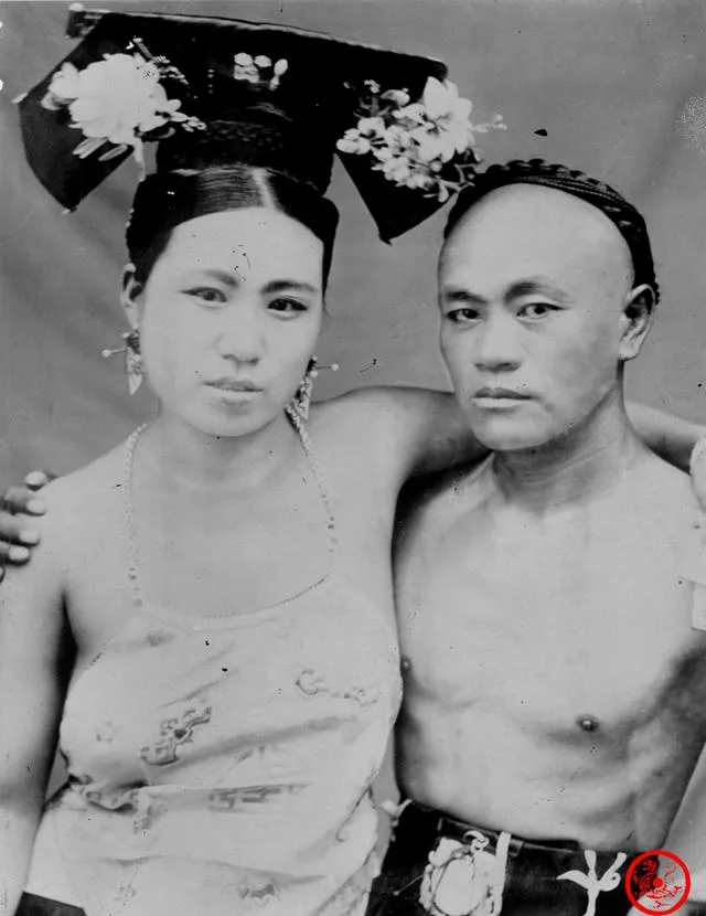 这张就大胆了,女子梳着高高的旗头,耳畔垂着长坠,身上穿着肚兜,男子赤裸上身,手臂搭在她肩上,两个人挨得很近,像是打破规矩给镜头看的,老辈人讲这类照片多半出自洋镜头师的主意,摆拍的味道足,可也让我们瞧见了那时的放肆和火气,现在社交平台上谁都敢贴吻照,那时候靠的是暗箱底下一瞬的冒险。