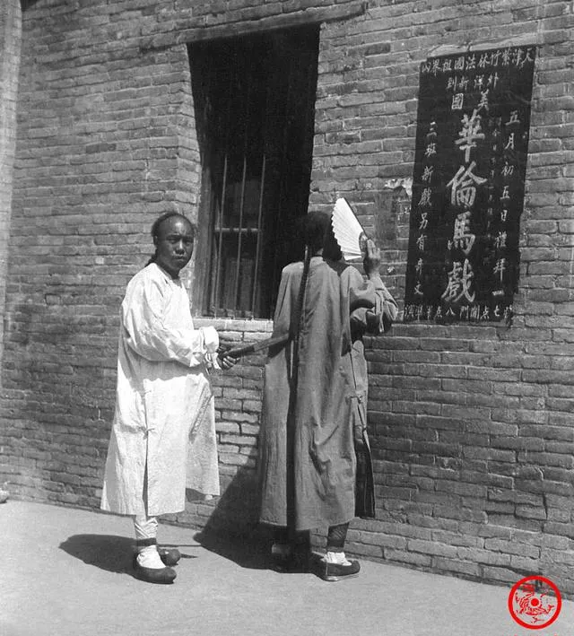 这个场景发生在天津,砖墙上贴着马戏广告,写着“外洋新到美国华伦马戏”,两位拖着长辫子的男的,一个眯着眼瞧字,一个拿扇遮日,光打在墙面上直晃眼,爸爸看见这张就笑,说**“以前想看个热闹得凑到墙根下,现在手机一刷节目就来了,”**一张纸能把半条街招呼走,那会儿的消息就这么简简单单地传。