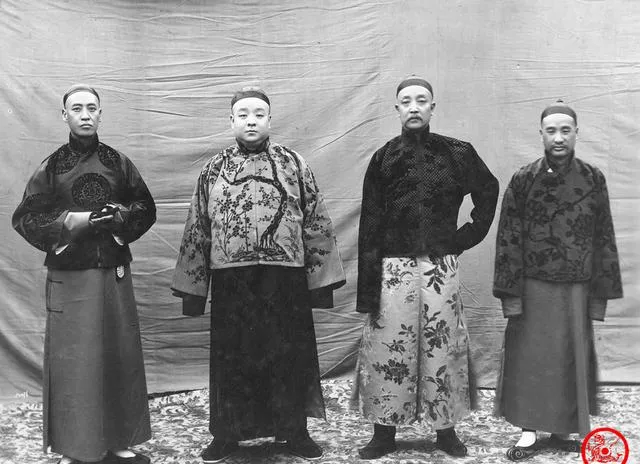 他们四人穿着讲究,瓜皮帽、马褂、长衫配得齐整,胸前的绣纹各不相同,有蝠有花,站位拉得开,像是要让布料的光泽在镜头里铺开,爷爷指着说,**“看袖口和下摆,就知做工细不细,”**衣料经得起光照,人的身形也就跟着立起来了,现在西装一套解决正式感,以前靠的是布纹、针脚和规矩。