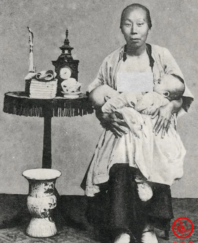图中抱着两个胖娃娃的女人是奶妈,衣襟解开,怀里左右各安一个,桌上摆着座钟茶盏和叠得齐整的布巾,像是特意摆拍的场景,主家要留下个体面,奶妈用自己的奶喂别家的孩子,从中挣口饭,自己的娃却多半喝米汤,妈妈说以前听村里老人谈起,奶妈一个月能拿不少工钱,可有规矩,产后就住到主家去,孩子哭夜她得起,主家孩子不哭她也得守在旁边,现在有奶粉有母乳喂养指导,那时候就是身体换口粮,直白得很。
