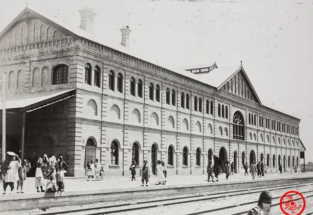 图中这栋三层的砖楼就是马家堡火车站,英国工程师监造的英式样子,一排排拱窗整齐排列,屋脊高挑,窗洞深,正中大拱门上嵌着玻璃窗,阳光透进候车厅就亮堂堂的,站台边铁轨平直延到天尽头,第一回见到这样气派的车站,老辈子都说,这气势在城南算是地标了。