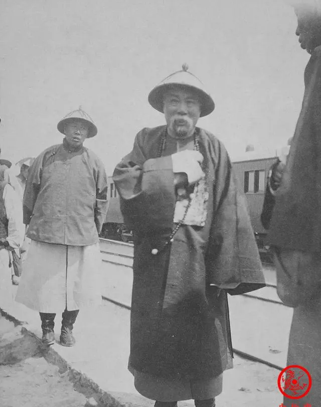 这位穿朝服的老官就是在站上迎接外宾的主事大人,胸前挂朝珠,身后是车厢和铁轨,人来得急,随从都还没站稳,他往前跨半步作揖,照片定住的是一刻仪式感,爷爷打趣说,官面上的讲究不少,可上火车也得掀袍角,规矩和新路,一起往前走。