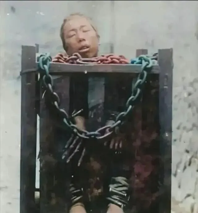 这个木头方架子就是坐笼,四面栅栏,链条粗得像蛇,脖颈手腕都被卡住,人困在里头连趴都趴不下去,照片上的脸涨得发白,嘴角挂着干涸的唾沫,风沙一吹,只有眼睛还在动,外婆看过一眼就把目光挪开,说别记这个,记住别再有这个。