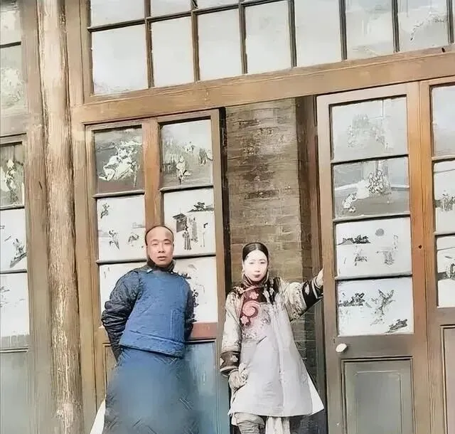 这张像是门口合影,木框窗格里贴着旧画,男人身上蓝坎肩打着褶,女人手搭门沿,眉眼清秀不张扬,像极了隔壁院会来借酱油的那家大嫂,小时候我问妈妈好不好看,妈妈说好看在耐看,不是那种一眼惊艳的,放到现在,这对人拍张证件照,估计也能刷爆亲友圈。