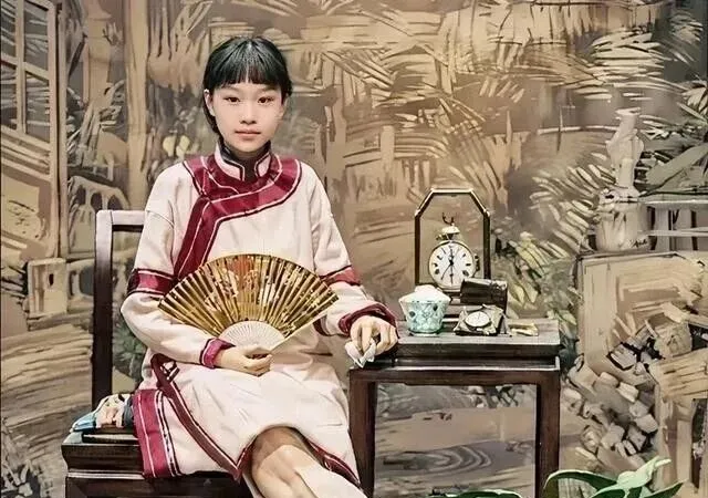 这个姑娘坐得端,手里一把小折扇,扇骨细而密,桌上摆个台钟,金边绕一圈,旁边一盏盖碗茶,茶托上的漆色被手磨得发亮,她眼睛里有点倔,像在等一个不迟不早的答案,爸爸看了笑,说这要放今天,也许就是学画画的那种小才女。