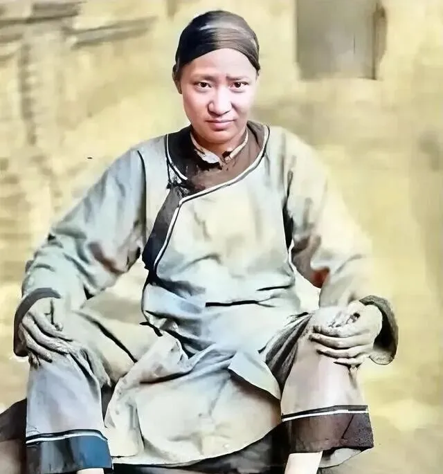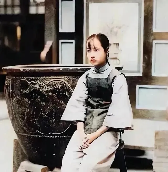 这个姑娘坐在大缸边,衣摆收得妥帖,身上浅色长衫配一件深色坎肩,手指尖细细的,眼神落在一处,不笑不闹,像等人又像在想事,若说美,不是花团锦簇的美,是越看越顺的美,放今天,镜头往她脸上一推,八成就成了大家眼里的古典脸。
