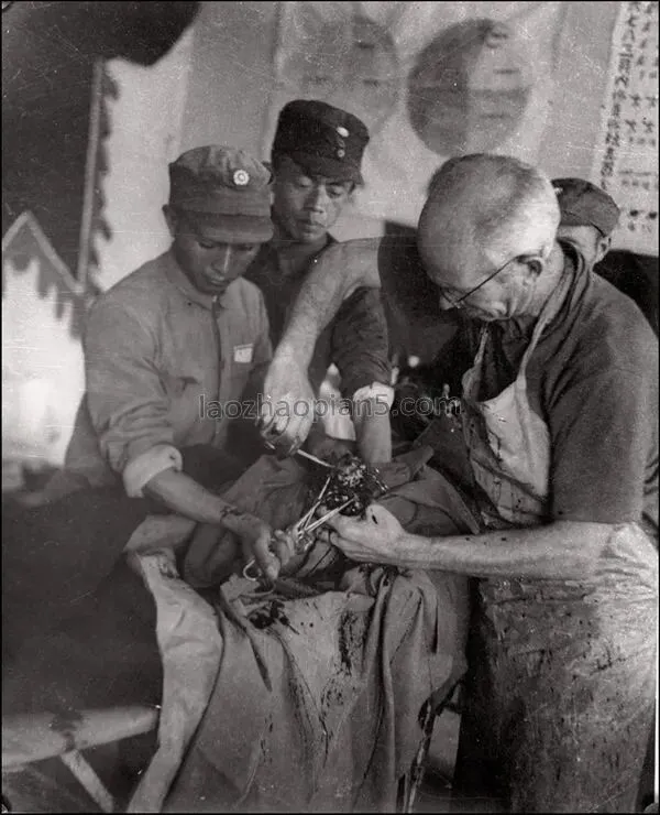 白求恩在山西五台松岩口模范病室动手术,左为晋察冀军区卫生部长叶青山。