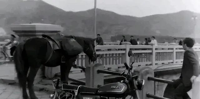 这张好玩,马拴在桥头低头找水喝,旁边停着**“金城”摩托**,两个时代挤在一张画里,我爸那时就说,能买得起一台摩托不容易,可骑起来也得悠着点,桥上风大,别打飘了.