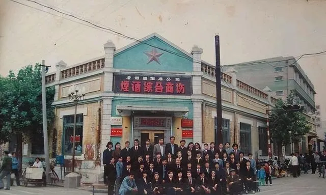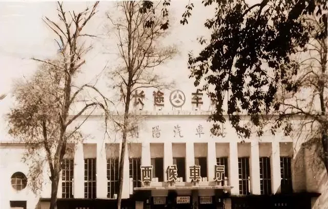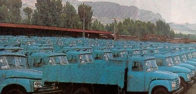 照片里一排蓝色卡车整整齐齐站着,旁边是汽车工业公司的厂房,师傅们穿着蓝工装在车间门口抽口气,太阳一晒,车漆亮得晃眼.