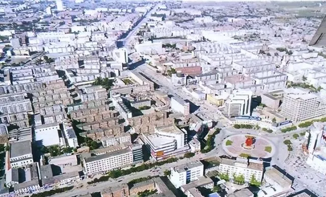 这张能看得更全,圆形大转盘像城的纽扣,放射出去的马路一条条,把街区缝在一起,新楼把老平房一点点挤到画面边上,时代就是这么悄悄地换景.