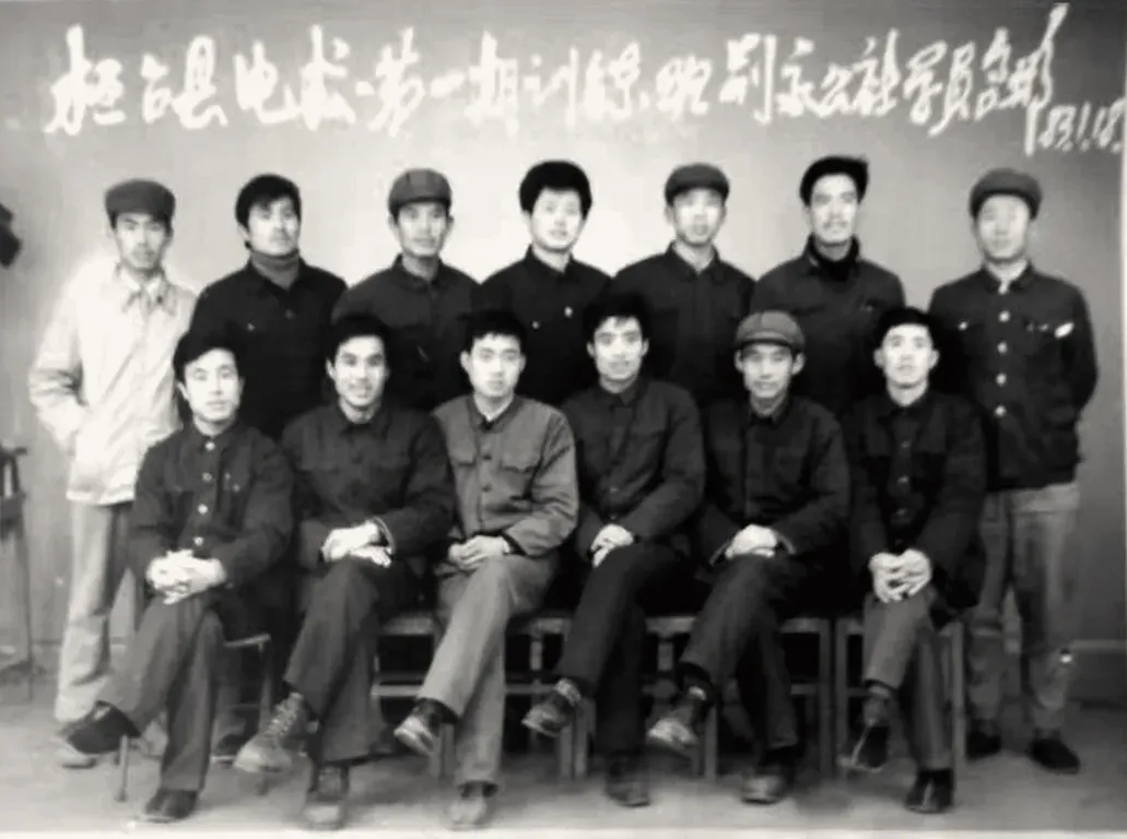 桓台电校建于1982年,坐落于县城槐荫路中断路东。此照片是1983年元月第一期电工培训班师生合影。参训人员有荆家公社、起凤公社、马桥公社、陈庄公社四个公社60名学员,时间一个月。培训内容电工基础理论、电机电器理论、供用电管理、电力线路施工技术等。校长张若忠,授课人张源、杨东、吕茂金、朱炳兰。桓台县电校后改为桓台电业招待所。(照片提供者:王树孝)