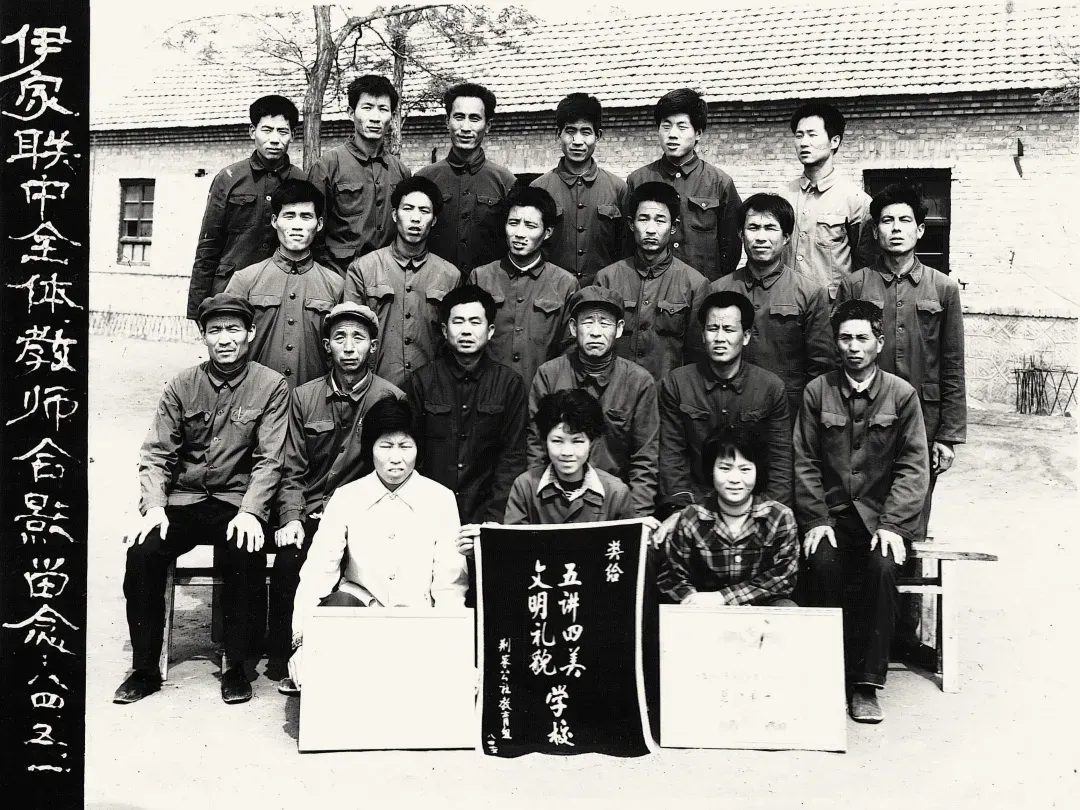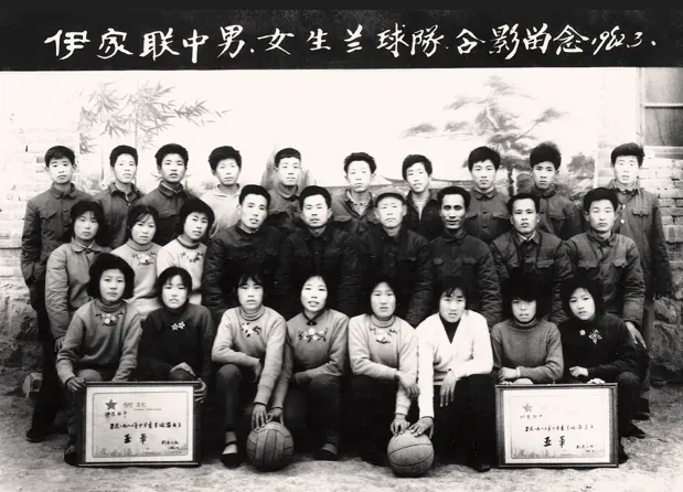 伊家联中成立于1970年,主要招收伊家、周董、前刘、东刘等村的学生。20世纪80年代初,校长刘书玳加强教学和管理,当时该校每年都有3~5名学生升至中专学校,学校中考成绩闻名全县。上图为1982年伊家联中在荆家公社组织的中学生篮球比赛中,学校获得男子篮子、女子篮球双亚军合影。下图为1984年5月伊家学校被荆家公社教育组表彰为“五讲四美”“文明礼貌”学校及文化课统考第一名后,联办村(伊家、周董、前刘、东刘)支部书记与全体教师合影。第二排左三为校长刘书玳。(照片提供者:刘书玳)