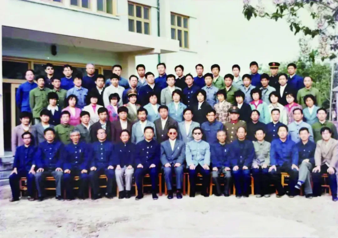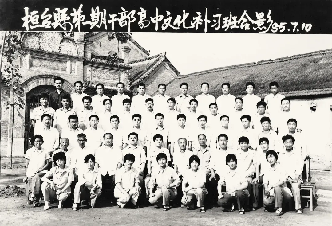 1984年9月,桓台县党政机关副科以上干部高中文化补习班在县委党校(高家大院)进行为期一年的文化补习。此照片为1985年7月10日,补习班结业时的合影。前三排左二为照片提供者。 (照片提供者:李功成)