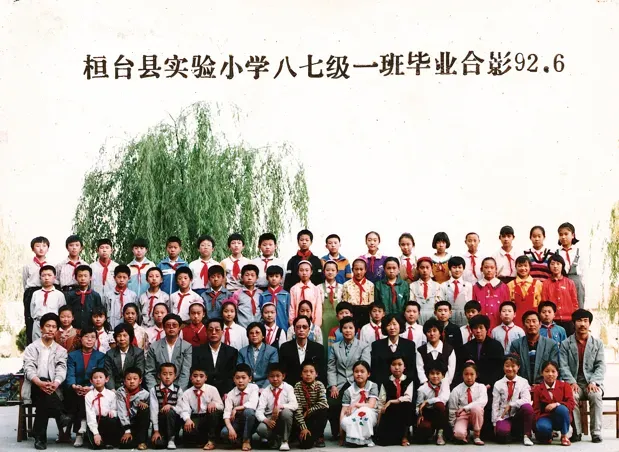 1992年6月,桓台县实验小学八七级一班学生在学校操场毕业合影。时任校长书记张连聿、副书记巩克兰、副校长刘爱勤、何象庆。(照片提供者:金树侠)