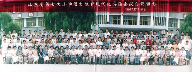 1996年7月17日,山东省第七次小学语文教育现代化实验会议在桓台县实验小学召开,与会人员在实验小学教学楼前合影留念。三排右一为照片提供者。(照片提供者:金树侠)