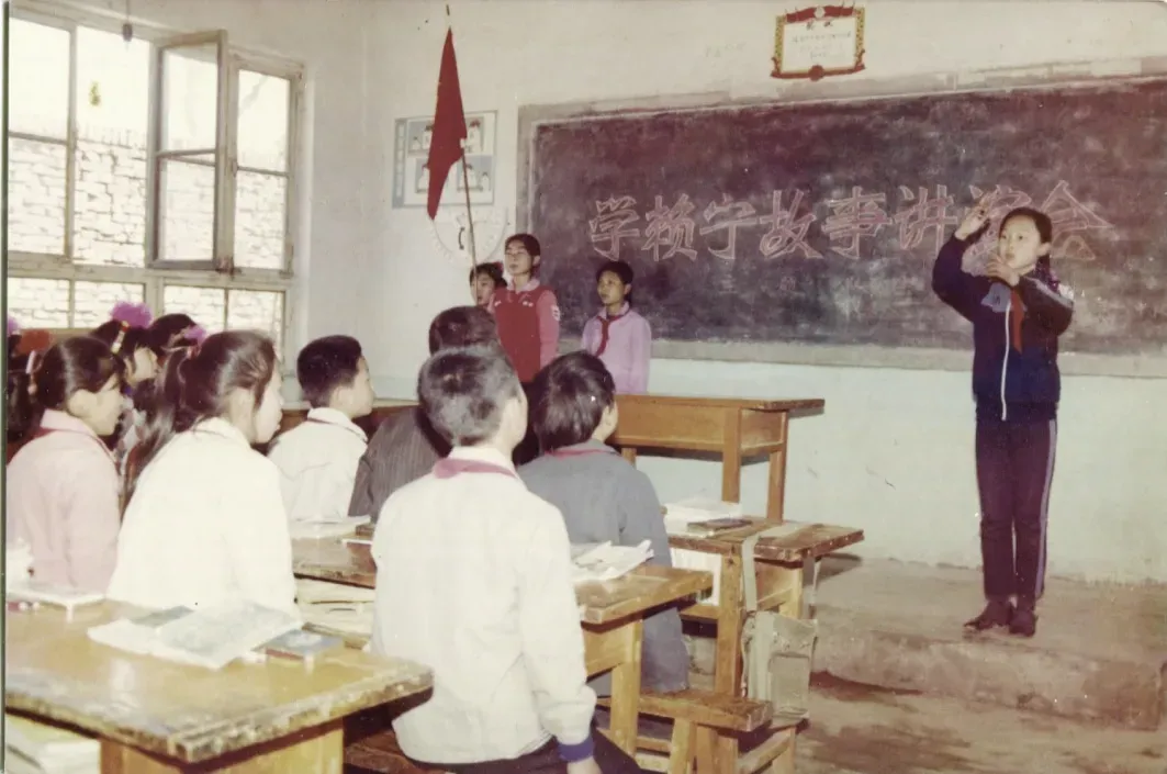 赖宁,四川雅安市石棉中学二年级学生。1988年3月13日,为了扑灭突发的山林大火,年仅15岁的他自动加入扑火队伍,在烈火中奋战了四五个小时,不幸遇难。1988年5月,团中央、国家教委做出决定,授予“英雄少年”光荣称号,号召全国各族少年向赖宁学习。并把他的事迹编入小学《思想品德》教科书中。此照片摄于1988年新城镇中心小学二年级,学赖宁故事演讲会现场。班主任耿嘉芬。(照片提供者:范立宏)