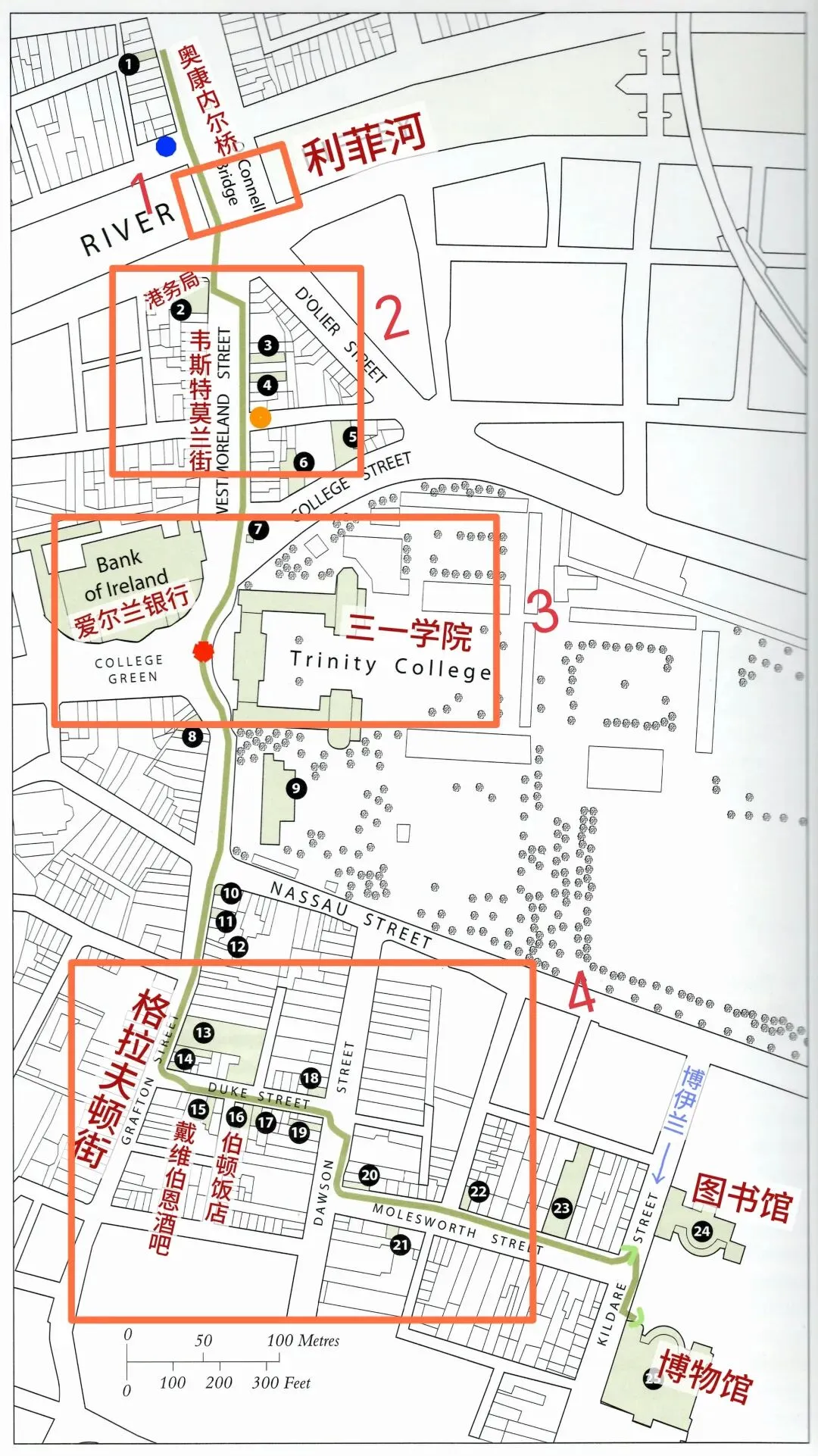 他将沿着图中绿线路过奥康内尔桥,跨过利菲河,一路向南,依次走向韦斯特莫兰街、学院绿地、格拉夫顿街等街道,在戴维·伯恩酒吧就餐,然后去往图书馆,由于见到迎面而来的博伊兰,他右转躲进隔壁的国家博物馆。如果我们将这条路线按地标大致分为四个区域,将会更有助于跟乔伊斯那可怕的大脑连上天线。