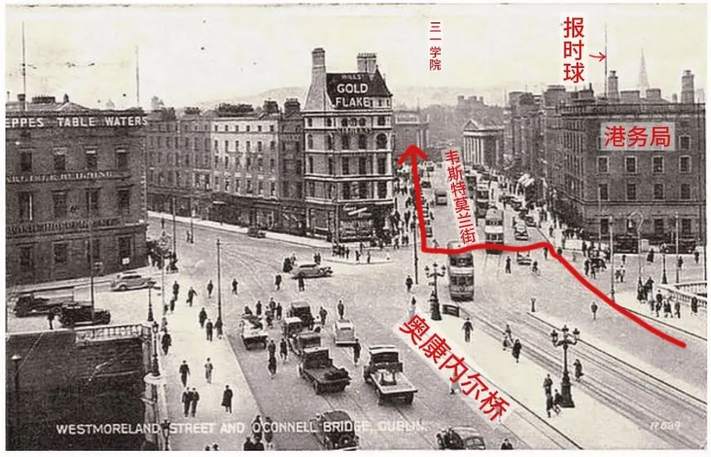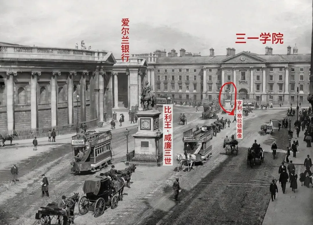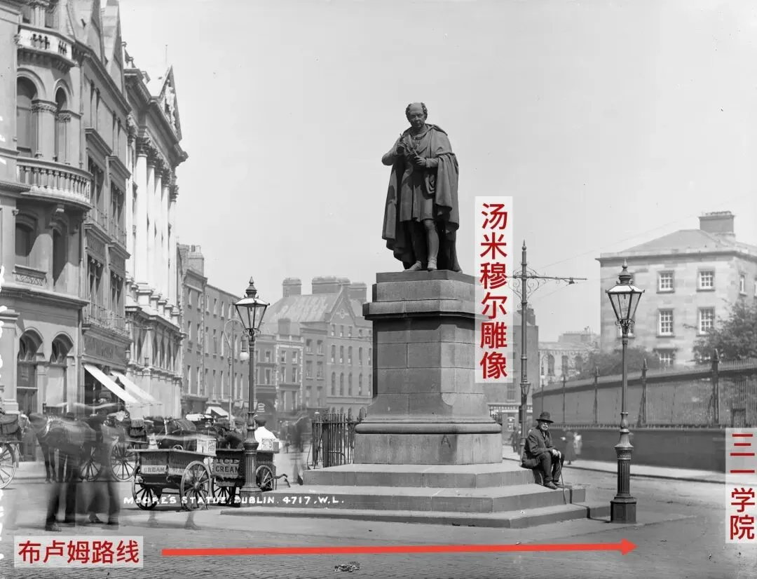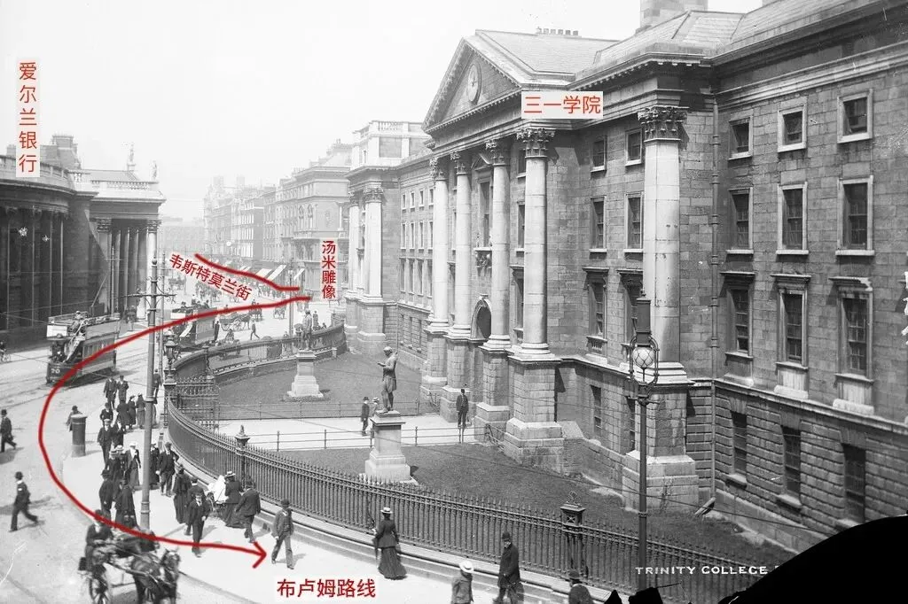 前面已经看到,当布卢姆从韦斯特莫兰街走来的时候,首先遇到的是汤米·穆尔的雕像。这个雕像就在图中三一学院左上街角(不在此图中)。“在比利王的胯下马凌空奋起前蹄的地方,布林太太一把拽回了急匆匆朝侍从马蹄下钻去的丈夫”。📎爱尔兰银行前面的亨利·格拉顿雕像,它正对着三一学院。第十章:“从印契科驰来的一辆电车,服从了格拉顿用严厉的石手发出的停车信号”。如果没有这些实景照片,似乎很难想象出比利王的马蹄、格拉顿的右手、汤米穆尔的手指头。⬆️现在回到布卢姆的路线,结合地图和刚好能拼合起来的旧照片,可以看到布卢姆是从照片的右上角走来,沿着三一学院前面的弧形栏杆,继续往画面下方的格拉夫顿街走去。