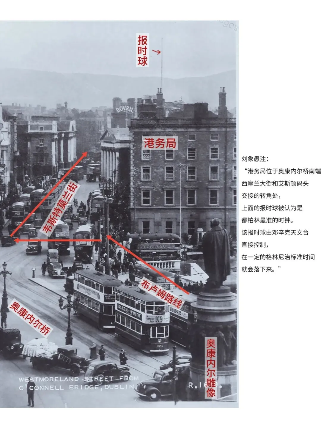 在对海量地图和资料的翻检中,我还发现甚至能通过上世纪的都柏林旧照片来使平面路线图实景化,我们可以从黑白照片中清晰地看到布卢姆走过什么街巷、眼前有什么建筑、那个报时球到底是什么,还能通过路线揣摩他在某处的心境。