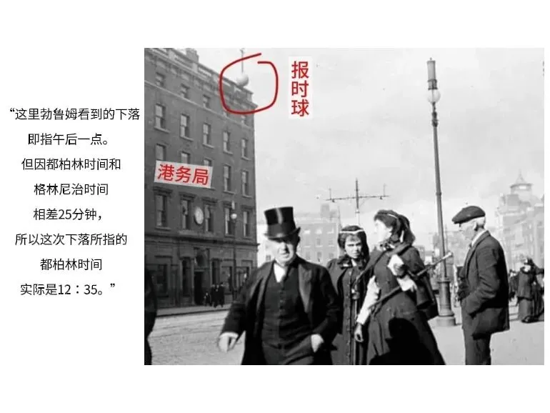 走过桥之后,他面前是港务局,他看到报时球降下来了,想到视差问题。