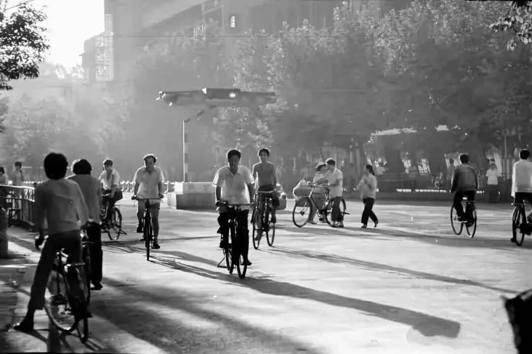 1980年的人民中路路口,街上没看到汽车,人们都是骑着自行车出行,人很多。