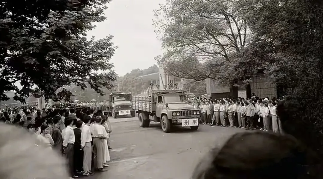1983年的人民中路,不知道发生了什么事,街上有好几辆警车开过来,马路两边站满了围观的市民。街道两边的绿化树长得十分茂盛。