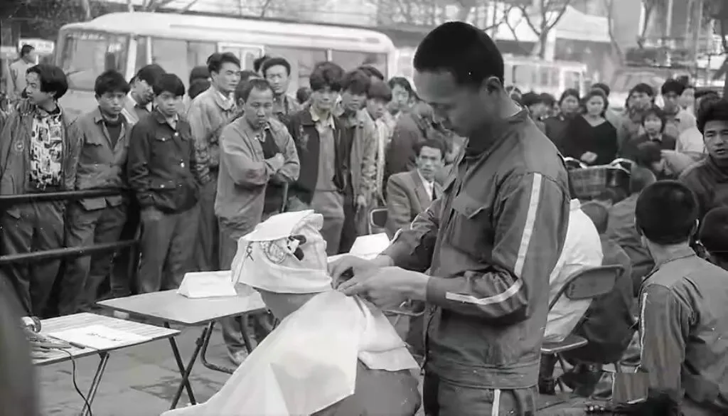1985年3月5日,郴州少年犯管教所组织少年犯为市民理发,旁边站着很多人在围观。