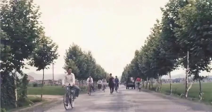 80年代的临武县下洞路,马路并不宽,路上有人骑着自行车来往。两边种着的绿化树长得绿油油的,马路外面是农田,远处有村庄,有不少的瓦房。这条路是出城的路口。
