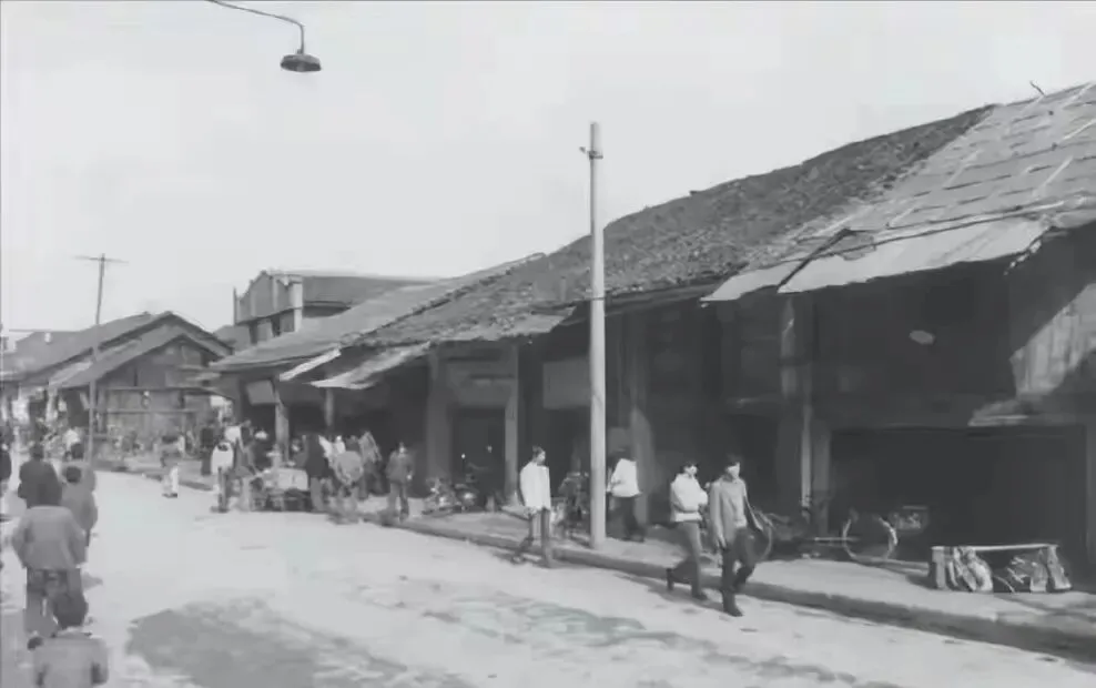 1986年改造前的解放路,马路上人来人往,两边都是木房子,十分老旧。