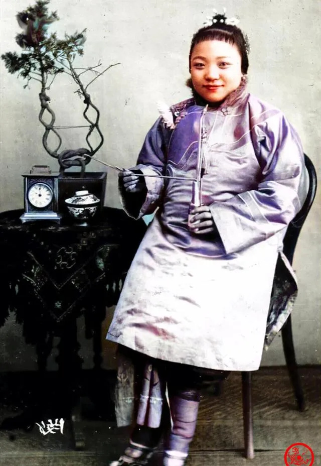 图中穿着绛紫色绸袄的年轻人手里捏着一杆细长的水烟杆,桌上摆着铜火盒、青花碗和一只小闹钟,器物不多却样样精致,水烟袋过一遍水才入口,劲儿小点儿,味道也柔和些,老太太说以前城里不少闺秀都爱这一口,屋里窗纸一糊,半晌只听见水泡咕嘟一响,脸上微微一笑,算是消遣。