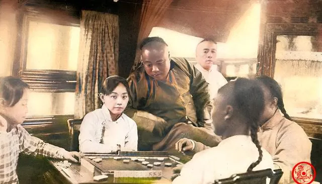 这一桌不是麻将,是更早的棋戏和骰子混玩的局,女子坐边上陪客,桌面上格子清楚,筹码堆在角上,屋里帘子厚,光从缝里漏下来,最靠镜头的那位丫头眼睛亮亮的,像在打量谁的手气更旺,我小时候跟着大人去茶馆,就爱听掷子骨落在木桌上的哒哒声,输赢不重要,热闹才是主角。