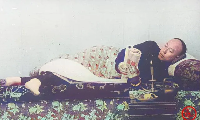 大白天偏要点一根蜡烛,躺在炕上挟着被卷看书,床前小案上摆了烛台、鼻烟壶和茶碟,满满一桌的讲究,书页厚而发黄,像是抄本,按理说坐在桌边念才入脑,摆拍也要摆得讲理,这张妙就妙在透出一种想当读书人的心气,别管真假,心里总想更体面点。