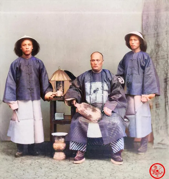 坐在中间那位戴朝珠,胸前补子是兽纹,按制算武阶不低,左右两个少年站得直,像从一个模子刻出来的,手里各执扇柄,墙角摆着灯罩、矮几、鼓凳,杂而不乱,镜头稳稳地把一家人的体面给定住了,妈妈说这样的合影得请懂规矩的照相馆,站位、眼神、衣角的折度都要有人盯着,现在一家人拍合照只需倒计时三秒,以前得磨上半天才按下一次快门。