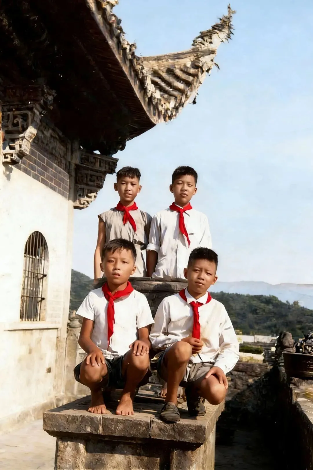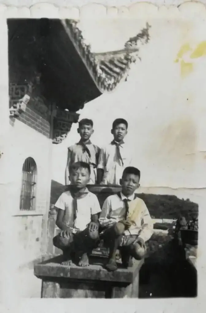此为上世纪七八十年代的四位少年在告天台上的石香炉上拍照,现在也该六七十岁了吧,有谁识得是谁家娃呢?(根据老照片修复)【白话文翻译】
