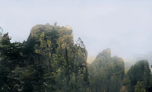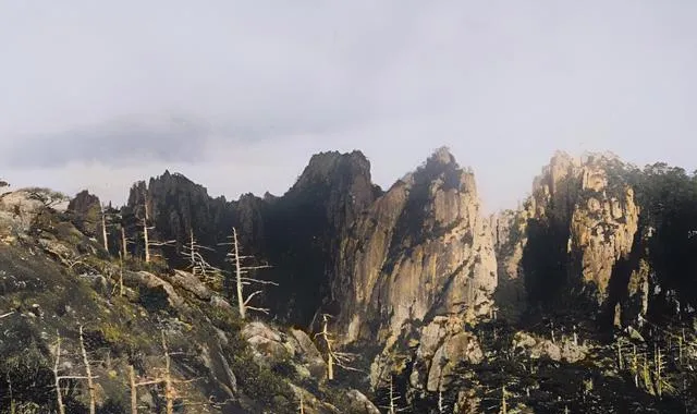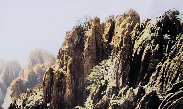 图上这块山梁叫不出名字,石壁像竖着的刀片,阳面被晒成金黄,阴面还带着凉意,松针密密扎在空中,风一过就刷啦刷啦响,奶奶说,黄山的松不挑地,石缝里也能活,活着就往天空里长,别看瘦,劲儿可大。