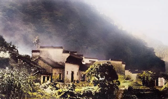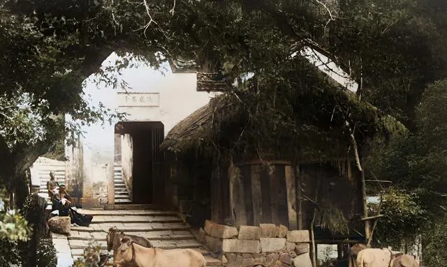 石阶爬到门坊,门洞里亮堂堂,墙上是清秀的小楷匾额,门口歇着两头黄牛,屋檐下堆着柴,土墙上留着烟火的痕迹,小镇子挨着山脚,早饭的蒸汽顺着树冠往上散,恬静得像一幅模板画。