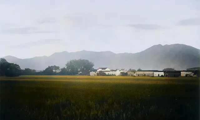 这幅是山下的稻田,绿色一层压一层,村前白墙黑瓦躲在树后,远处山影淡得像水墨,风吹过稻浪起伏,声音柔软,妈妈说,以前收割完要挑谷上场,路过时能闻见稻草混着泥土的香味,现在多半是机器黄灿灿地一卷就好。