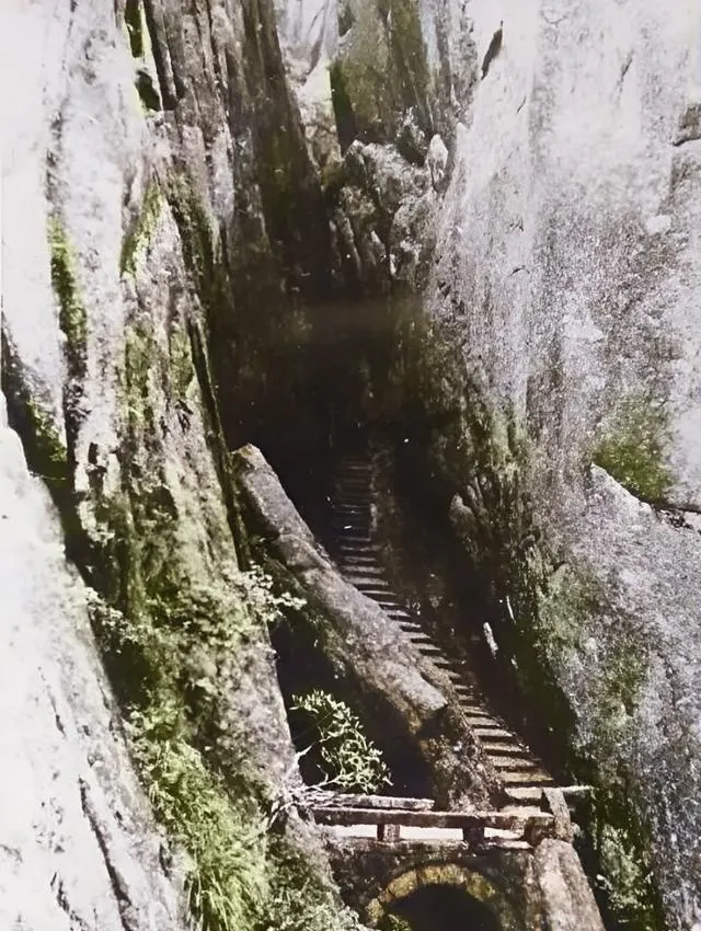 这张最险,石壁贴脸,湿漉漉的苔把颜色压得更深,中间只留一条木梯往上,宽处两步并排,窄处得收着肩膀走,抬头只剩一线亮,像有人用刀在天上刻了个缝。