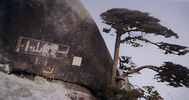 这个近景拍的是石壁,旁边倚着一棵松,枝条被风梳成了偏分,石上刻着“一览众山小”五个字,刀痕还留着锋利的边,早年只有这行字,现在刻的多了,字是多了,山还是这座山。