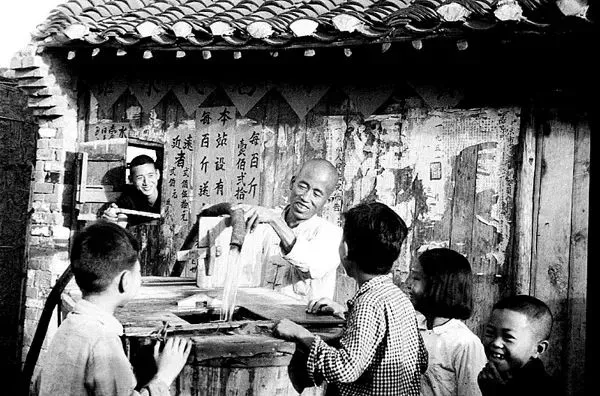 1953年,南京估衣廊街,市民在供水站买水。50年代初期,南京一般居民家中无自来水供应,要去自来水站买水喝。晓庄/摄。