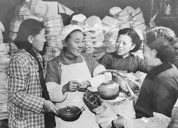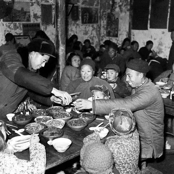 1959年,人民公社实行食堂化,这是南京市燕子矶公社社员欢度春节吃年夜饭 。晓庄/摄。