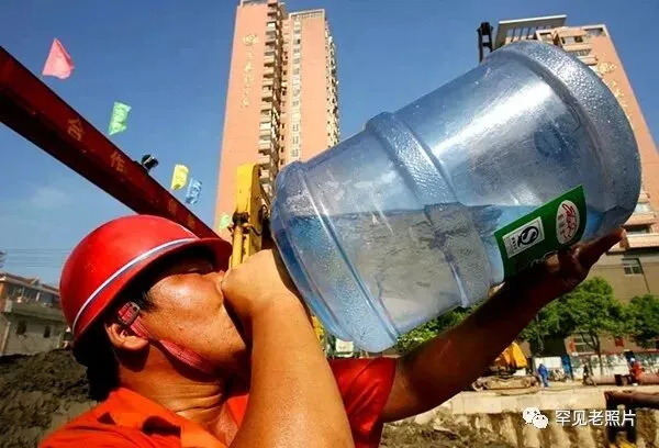 2006年8月3日,南京一建筑工地,由于天气炎热,一工人拿着桶装水桶直接饮水。图片来源:东方IC。