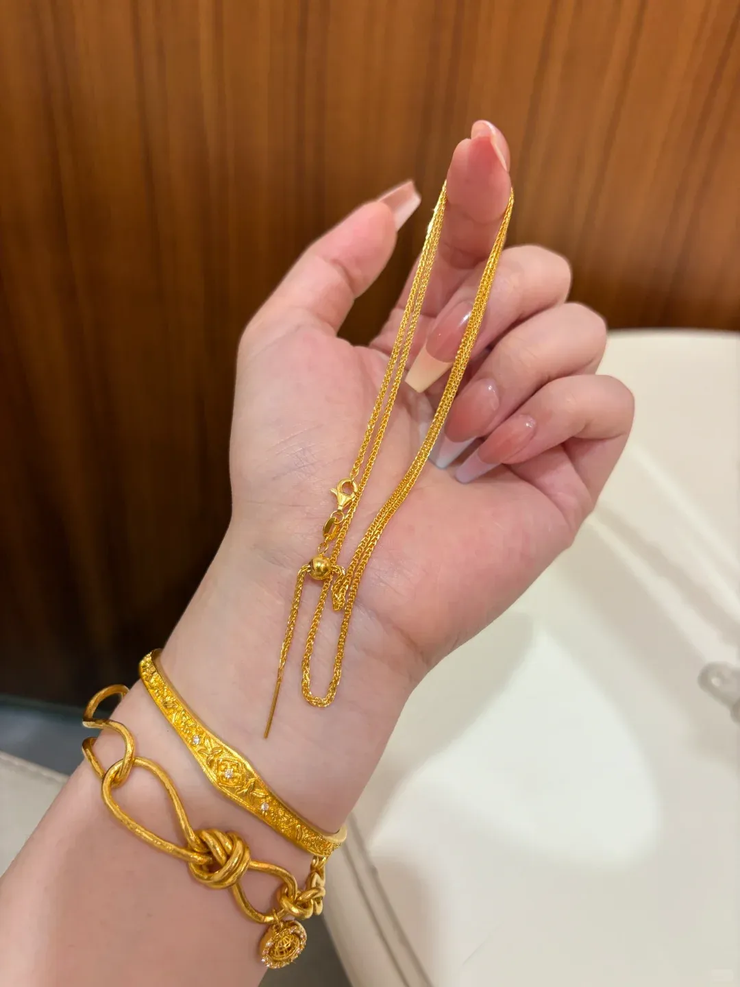 选购的时候我有点犹豫,因为黄金项链有很多不同的链型和长度。我最后选的是45cm的长度,刚好卡在锁骨位置,既能修饰脖子,又不会太浮夸。大家如果脖子比较细,可以选40cm,效果会更精致。保养方面其实很简单,平时注意不要和硬物摩擦,偶尔用中性洗涤剂泡一下擦干就行了。我还有个小tips,就是睡觉或者运动时候最好摘下来,这样能保持它的光泽更久。有朋友问我黄金会不会容易氧化变色,我用了一段时间,发现只要不碰化学品,基本不会有啥问题,偶尔擦一擦就像新的一样。