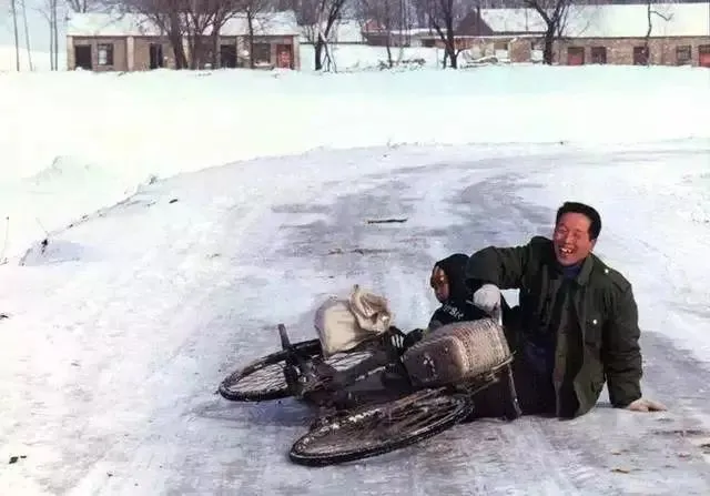 路上结冰,骑洋车子摔倒了也是哈哈一笑