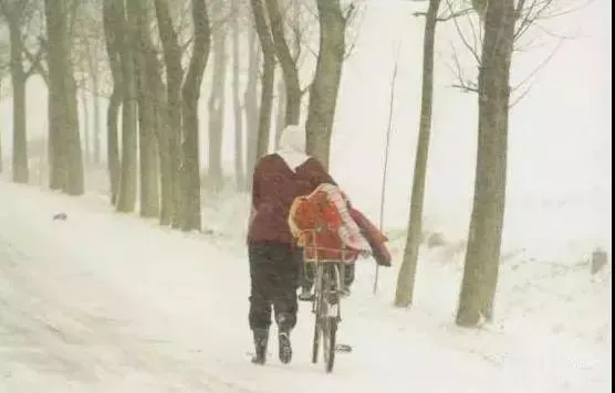 雪再大,路再滑,亲戚该走还要走,能骑车了骑车,不能骑车了步行,不知道你注意了没有,大伯身后还蹲着一个小孩子。
